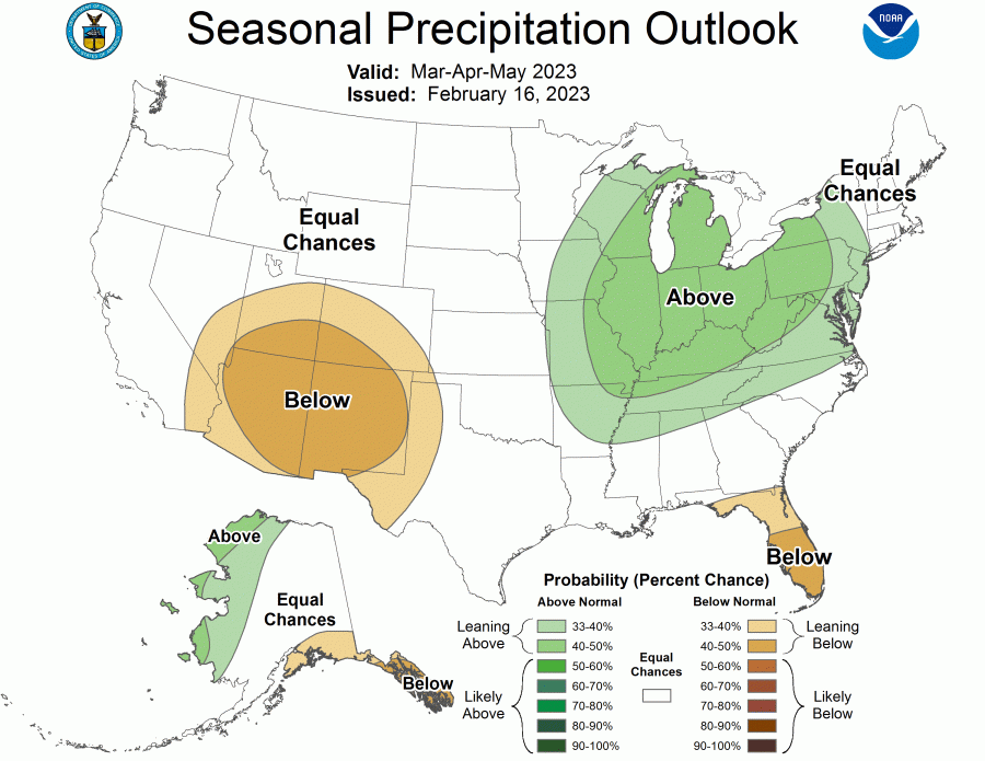 NOAA is predicting a continuation of above-normal temperatures and precipitation through early spring in Ohio. and across the Southern and Eastern states. The Pacific Northwest eastward to the northern Plains are expected to have a colder-than-normal spring.