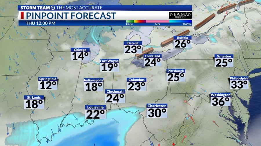 By noon, we will start to see not only more clouds, but the light snow spreading east across Tennessee, Kentucky and along the Ohio River.