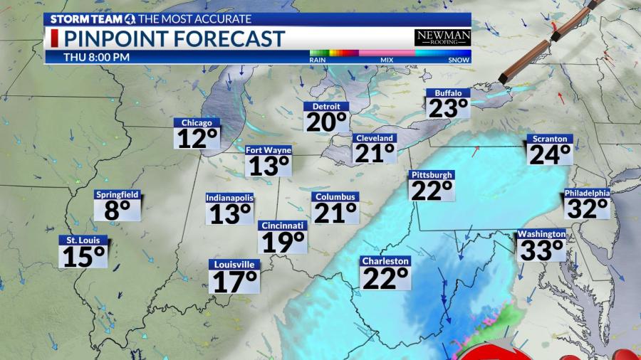 The direction of the snow will be driven by a counterclockwise flow around an area of low pressure over the Southern states. As the low pushes through Middle Tennessee, light snow will expand northeast along the I-71 corridor.
