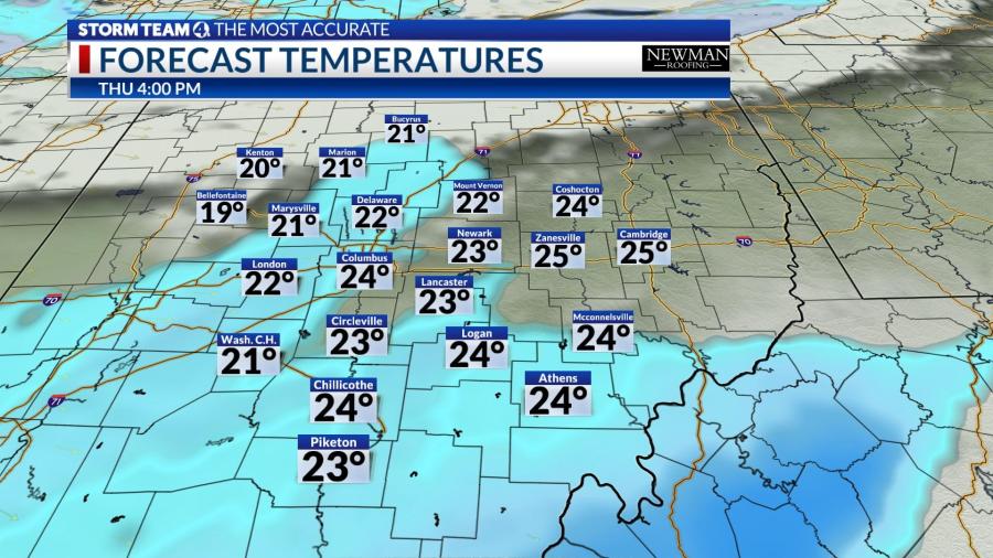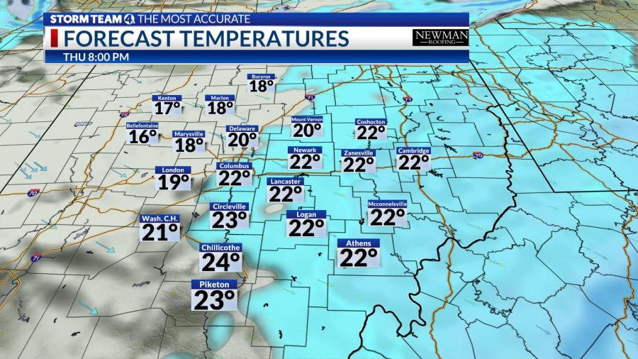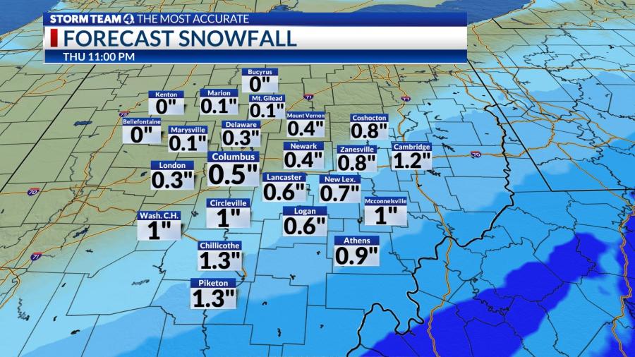 Columbus is on track to pick up a light coating of snow, especially near and southeast of the I-71 corridor, totaling a little less than an inch An inch or a little more will fall south of Route 22. Southeastern Ohio will receive 2 to 3 inches, with the highest totals near the Ohio River.