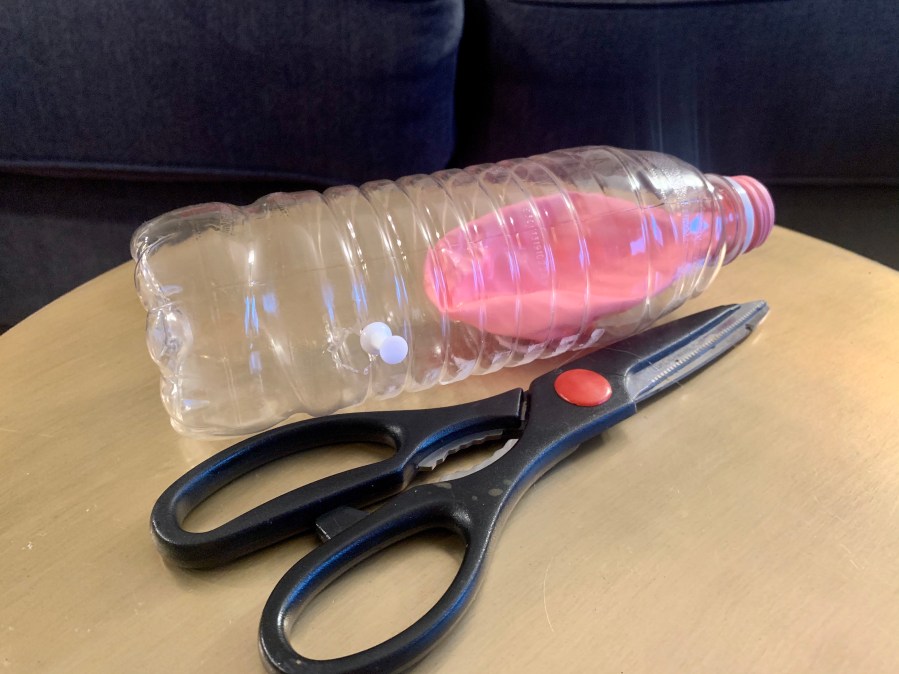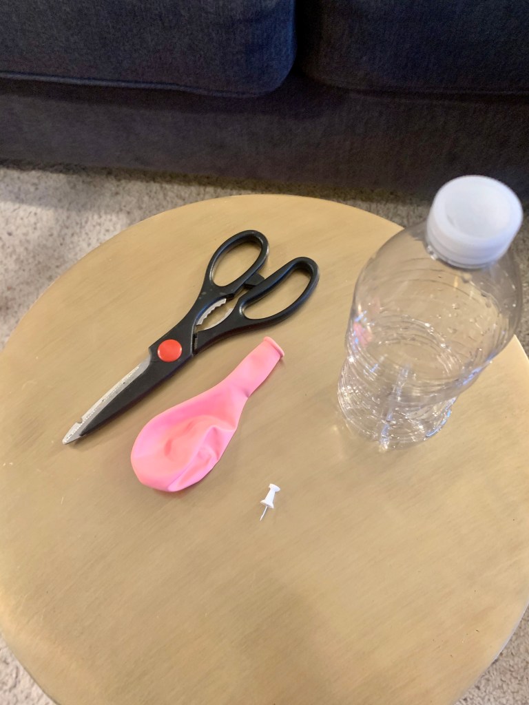 Start by gathering an empty water bottle, balloon, and a pushpin or scisors for later.
