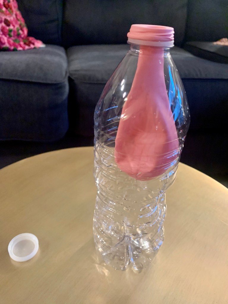 If you put the cap back on the water bottle, this will close off the balloon, and it will stay inflated because the pressure is equalized.