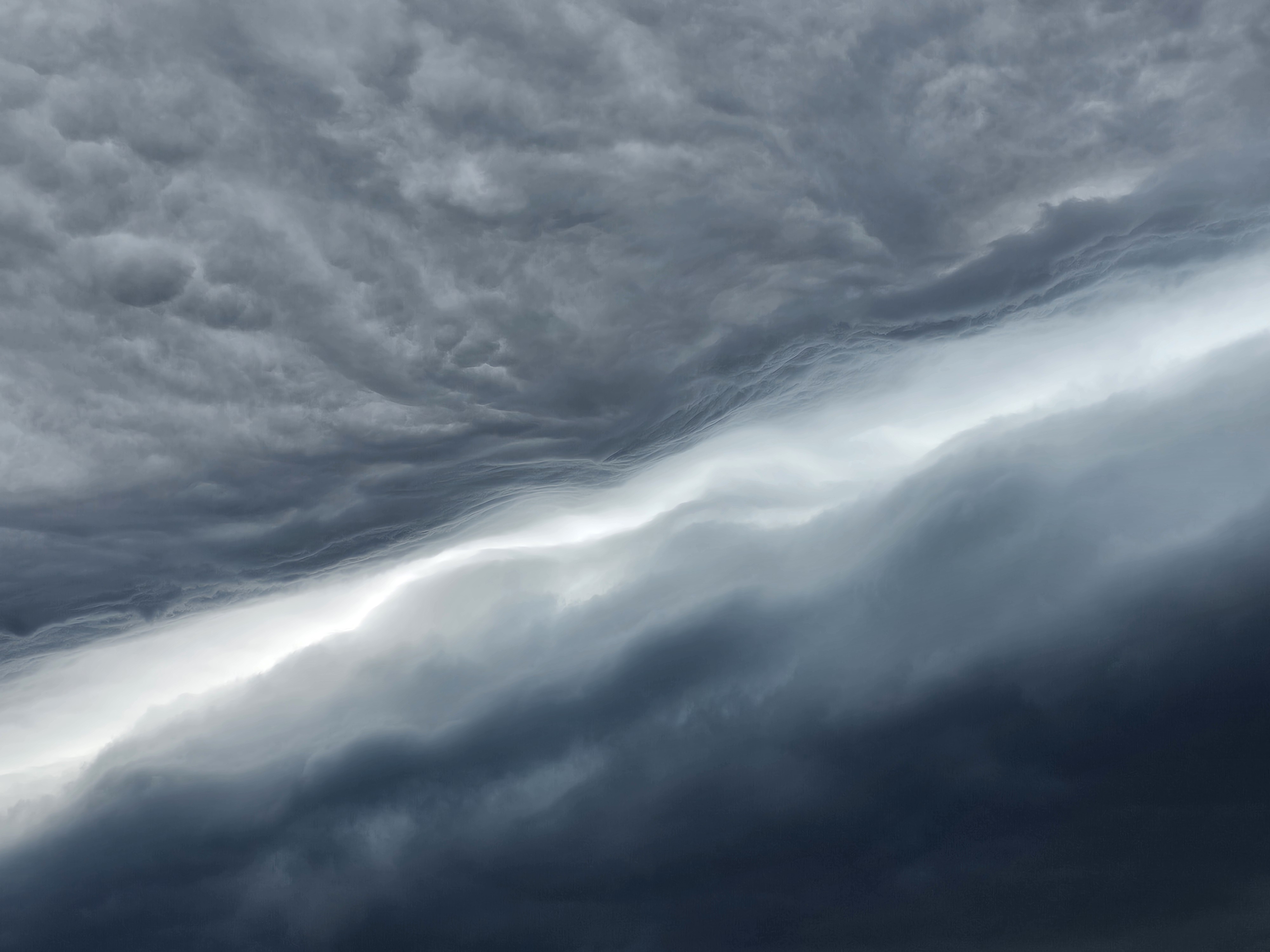 The unusual cloud formation spans the sky, horizontally, associated with a fast-moving complex or line of thunderstorms, marked by gusty winds just ahead of the rain.