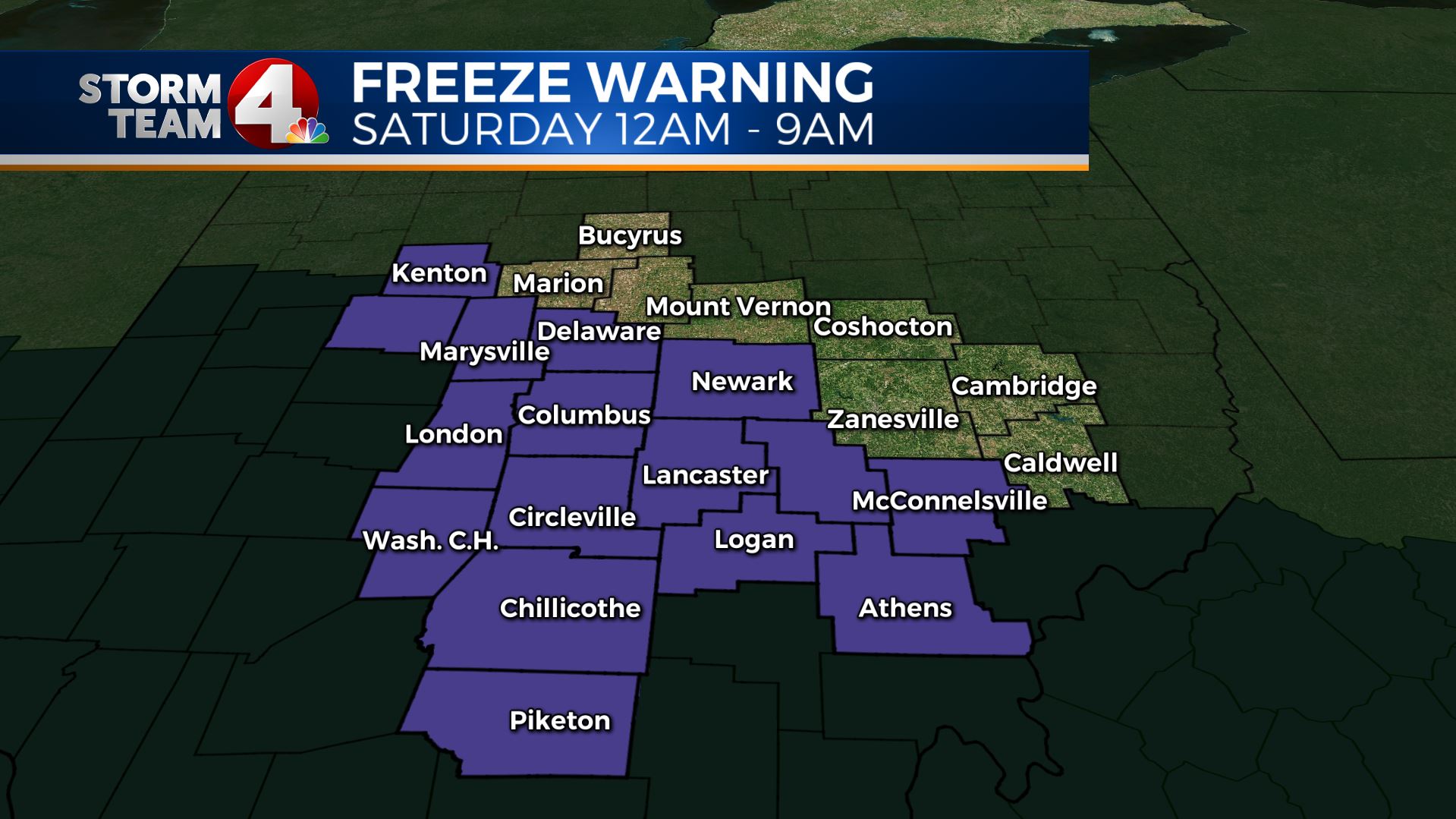 Columbus (WCMH) – We had snow last night and this morning, and now we have a Freeze Warning overnight tonight, so how about a bit of good news? We are about to see a huge warm-up this weekend!First, yes there is a FREEZE WARNING tonight: