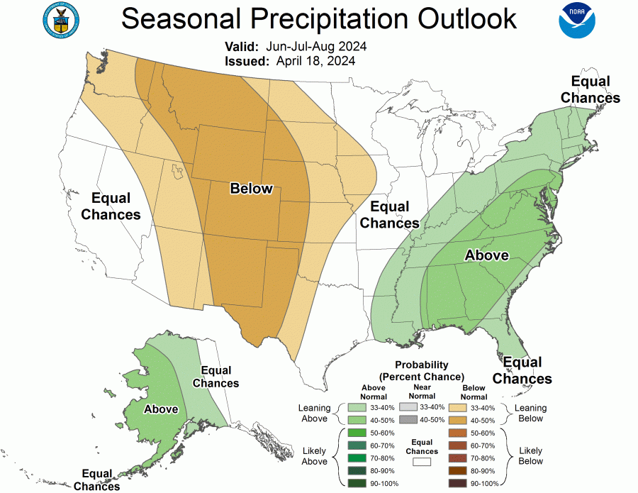 Summer rainfall totals are trickier to predict because storms tend to become more localized compared to the rest of the year, and depend on a combination of humidity and relatively weaker disturbances. However, odds favor a fairly wet summer over the eastern third of the country, and much drier conditions in most of the West.