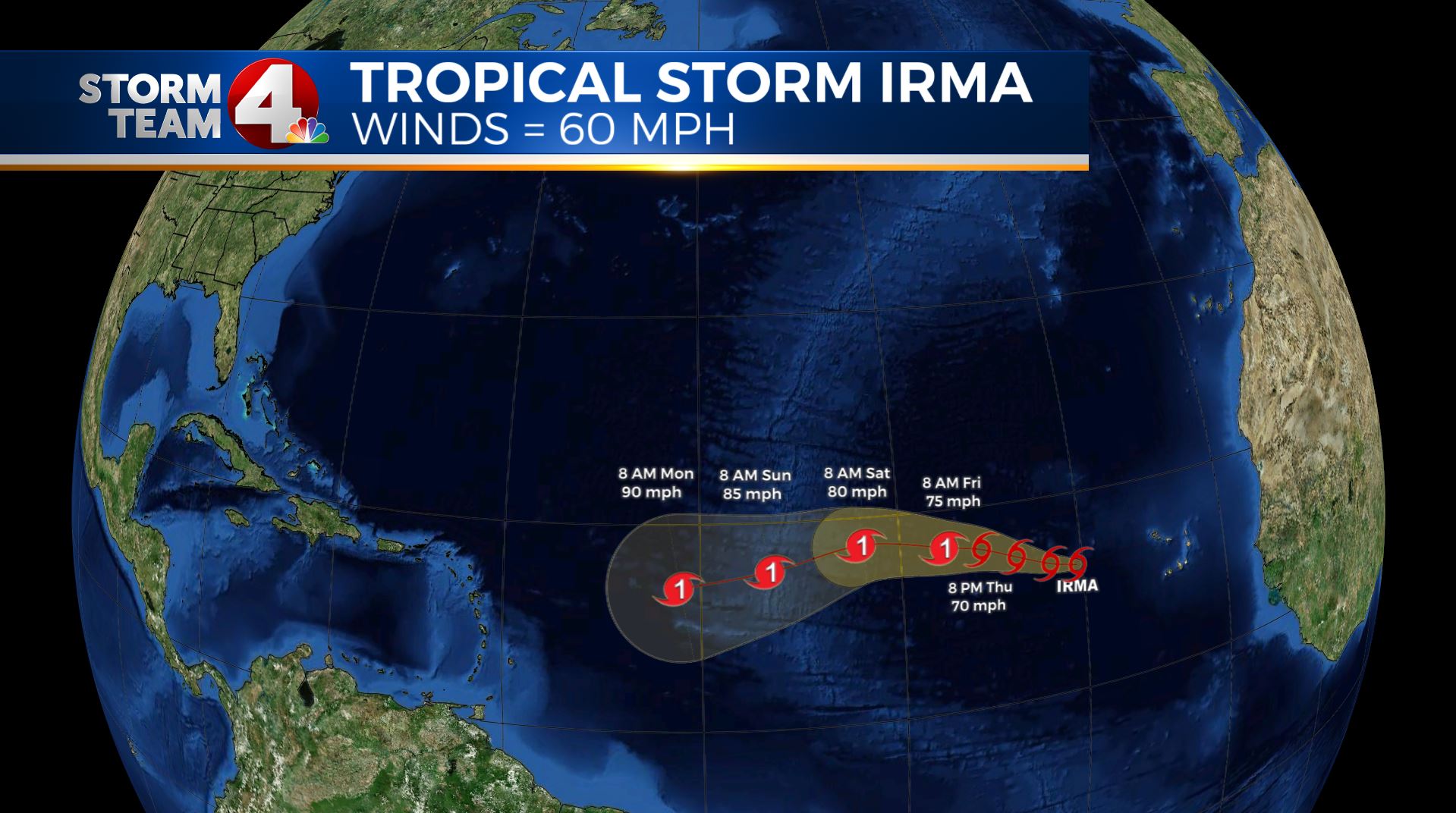 Irma is currently a tropical storm, and has winds in the 60 mile per hour range, and is expected to slowly intensify over the next 24 hours. Right now, it is still moving over not amazingly warm waters, so it should not explode in intensity yet.