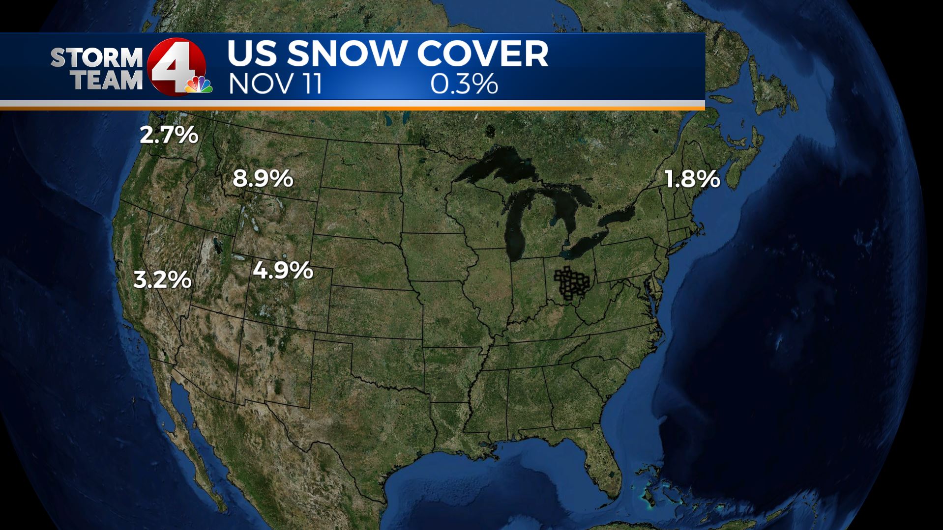 On this map, I noted the areas of the country that actually have some snowfall, and what percentage of that region has it. Notice a complete absence of snowfall in the upper mid section of the country and the Great Lakes states.So how strange is this that we have almost no snowfall on November 11th across the lower 48?