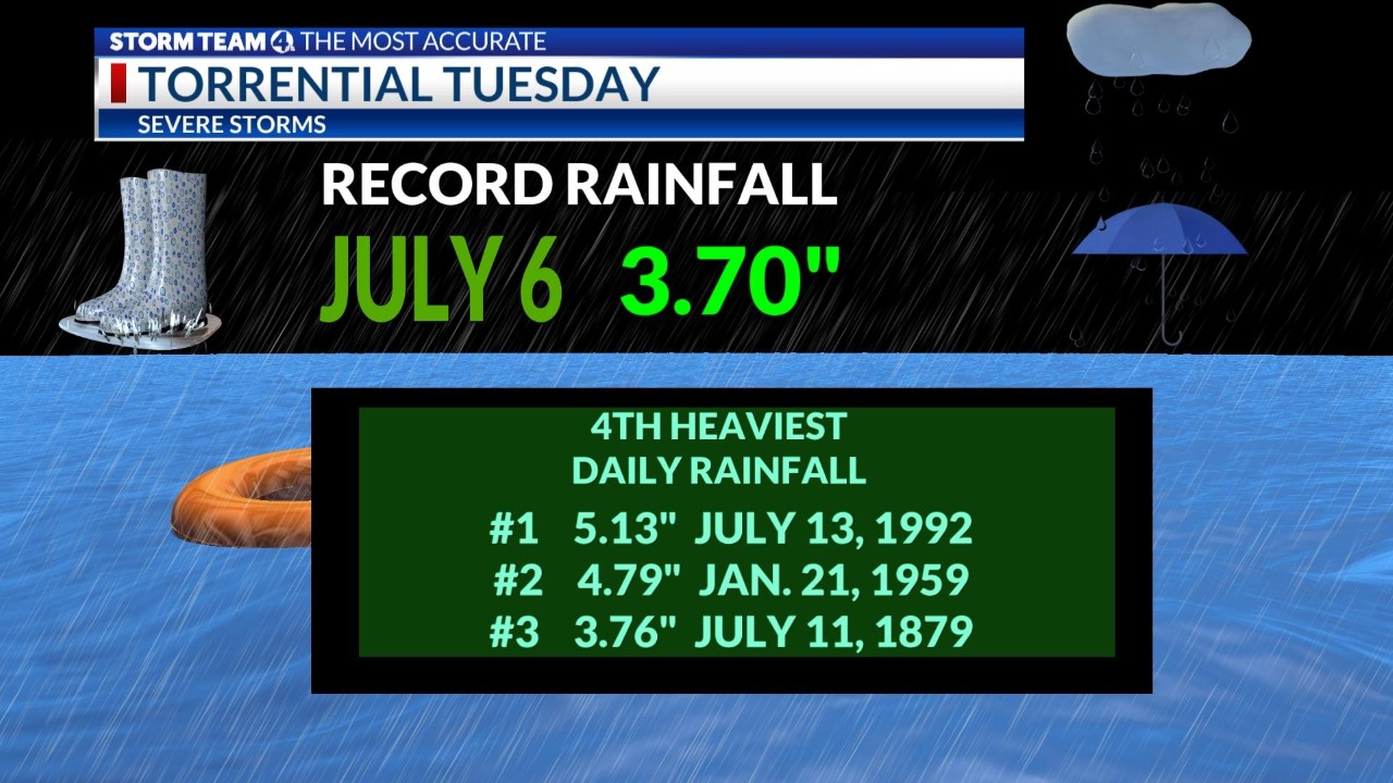 Columbus tallied a record 3.70 inches of rain on July 6, most of that falling in a few hours just after midnight, the fourth heaviest single-day rainfall in city records that extend back to 1879. The previous mark for the date was 2.67 inches in 1955.