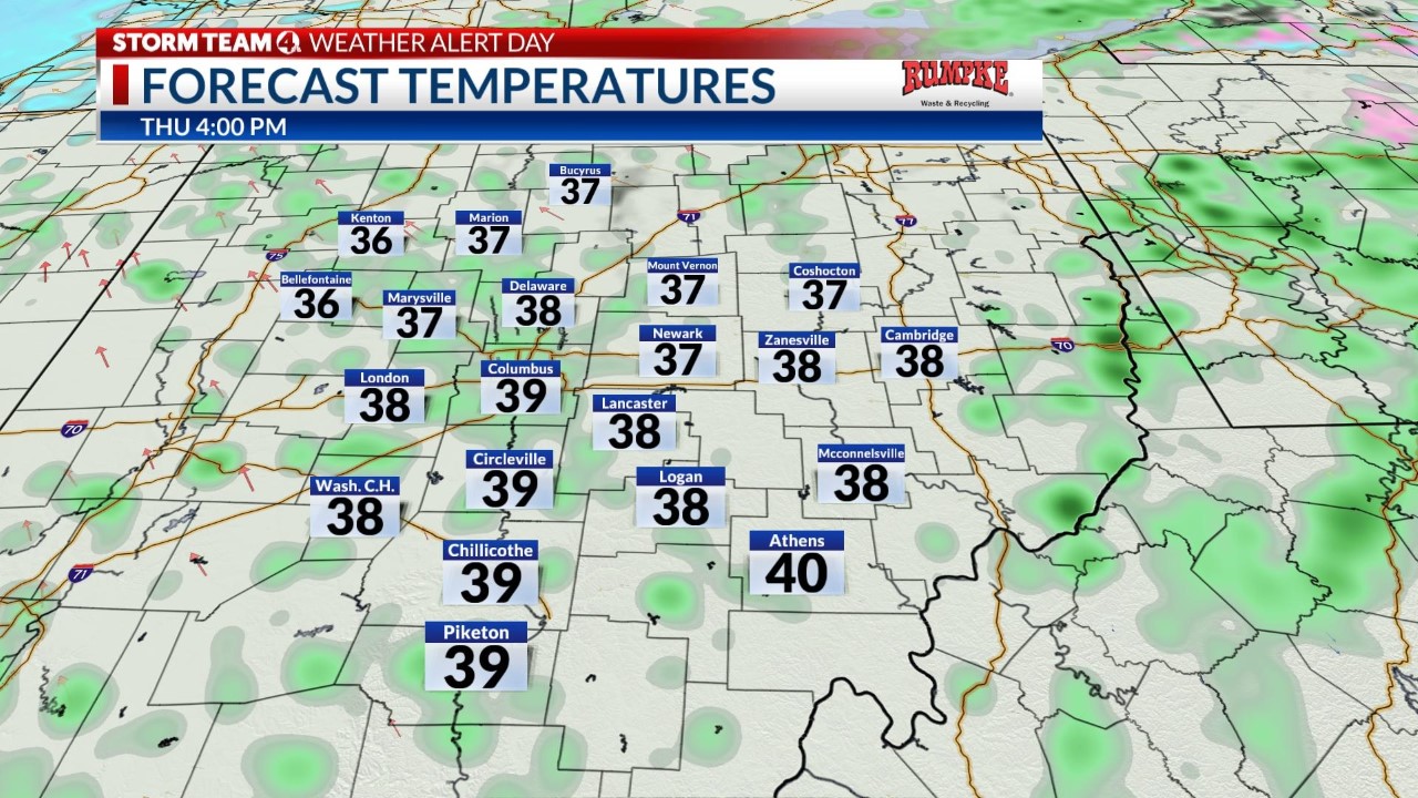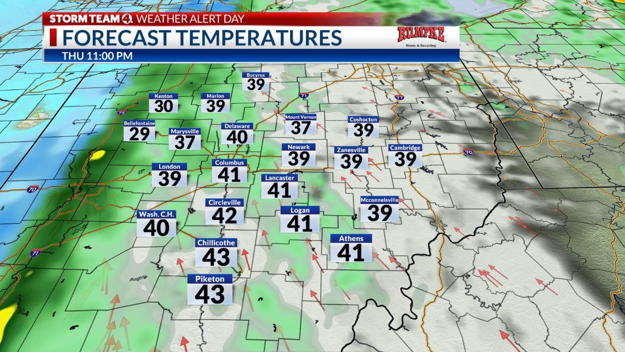 A mild southerly flow ahead of low pressure will initially bring periods of light rain, with temperatures in the low 40s.
