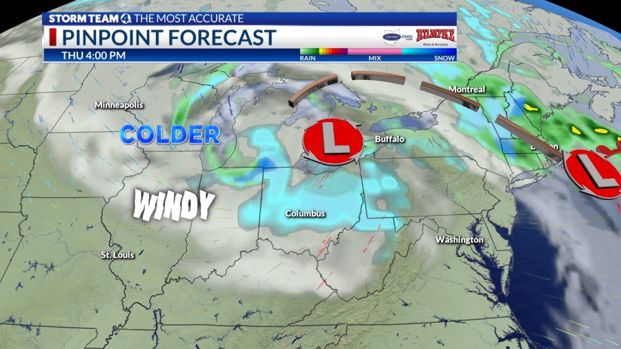 A deepening pool of cold air will settle over the Upper Midwest and Great Lakes midweek, with a developing wave of low pressure pivoting southeast across northern Ohio on Wednesday. Rain will change to snow Wednesday night, with bands of lake-enhanced snow showers reaching central and eastern Ohio Thursday.