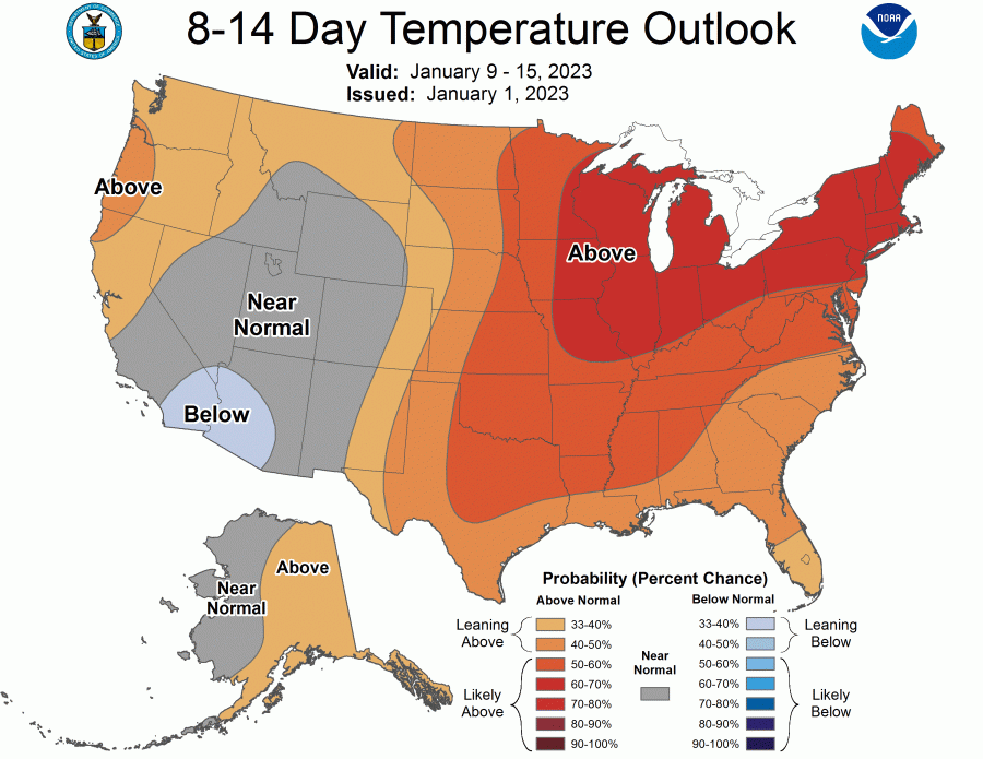 After a period of seasonal chill, NOAA’s 8- to 14-day outlook favors a return to warmer-than-average weather over much of the country dominated by a Pacific flow of mild air.