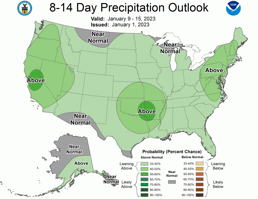 Precipitation is projected to be a little above normal over the Eastern states during the second and third weeks of January and across the southern Plains and Far West.