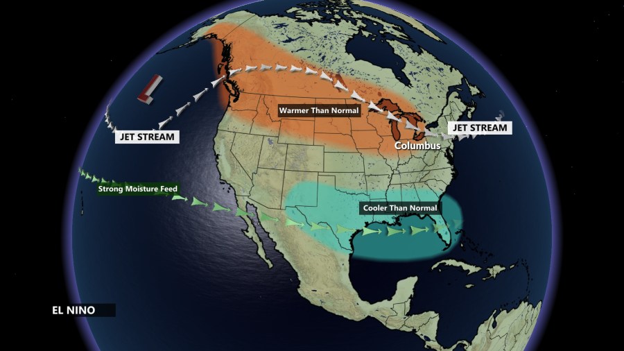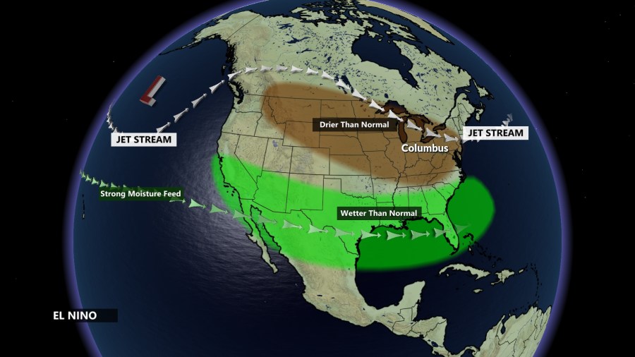 El Niño typically gives us drier and warmer than normal weather for the winter, as the Polar jet stream tends to stay well north of our area. The Pacific jet tends to stay well to our south, closer to the Gulf. The combo of these two keeps the cold air north of us and the wet air to our south.