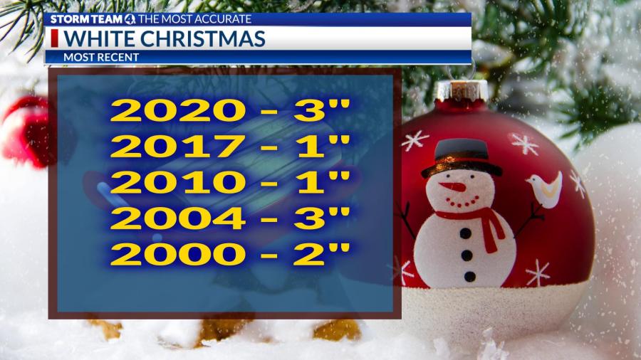 The snowiest Christmas Day goes way back to 1890 (7 inches), and the greatest cumulative snow depth of 9 inches was recorded in 1960. The 1960s featured a series of white Christmases unlike any other decade.